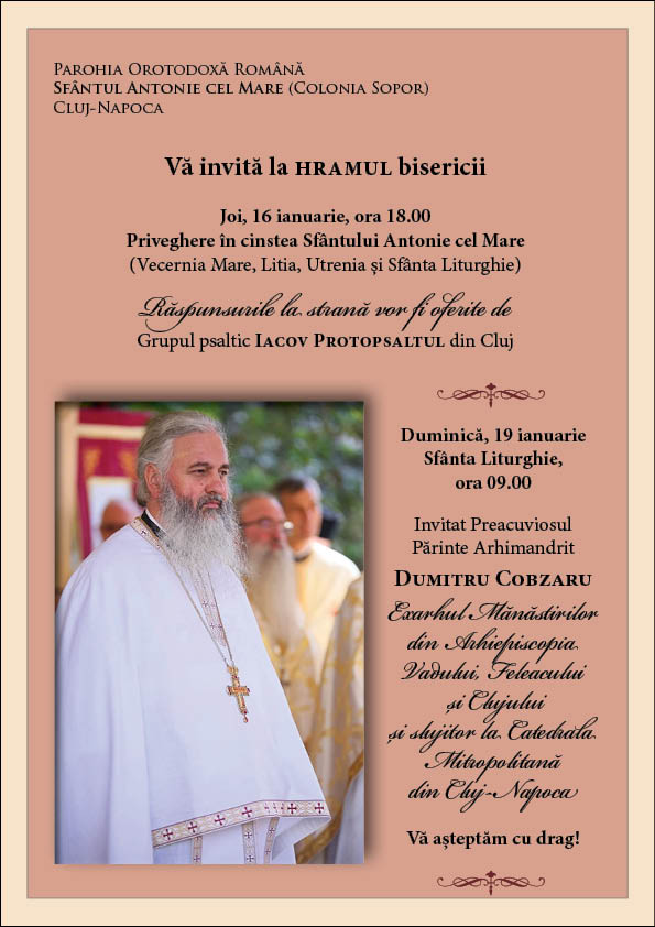Ca în fiecare an, Parohia Sfântul Antonie cel Mare din Cluj-Napoca, îşi va sărbători hramul pe 17 ianuarie 2025, astfel în ziua de ajun, marți, 16 ianuarie 2025, de la ora 18.00, se va oficia slujba Privegherii (Vecernia Mare cu Litie, Utrenia) urmată de Sfânta Liturghie, de un ales sobor ...